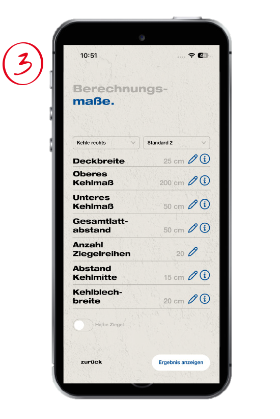 Gib deine ermittelten Maße für die Berechnung ein (Deckbreite des Ziegels, Lattabstand und Anzahl der Ziegelreihen).