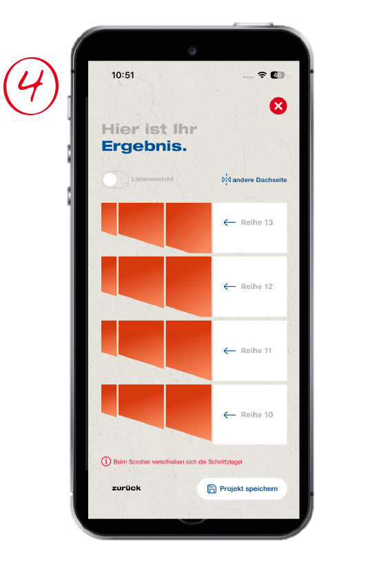Die App berechnet den Zuschnitt für jeden einzelnen Ziegel. So kannst Du diese unkompliziert und einfach mit der Ziegel-Anreiß-Schablone anreißen und anschließend zuschneiden. Über eine Listenansicht besteht die Möglichkeit, alle Ziegel zu sehen und bereits angerissene Ziegel abzuhaken.